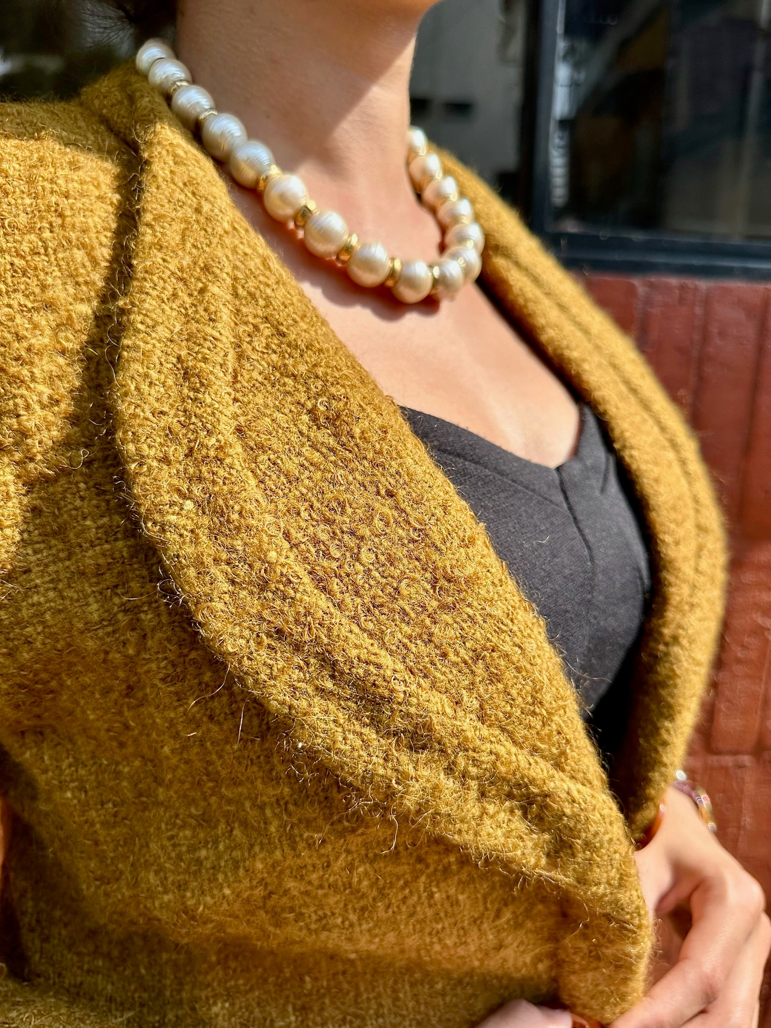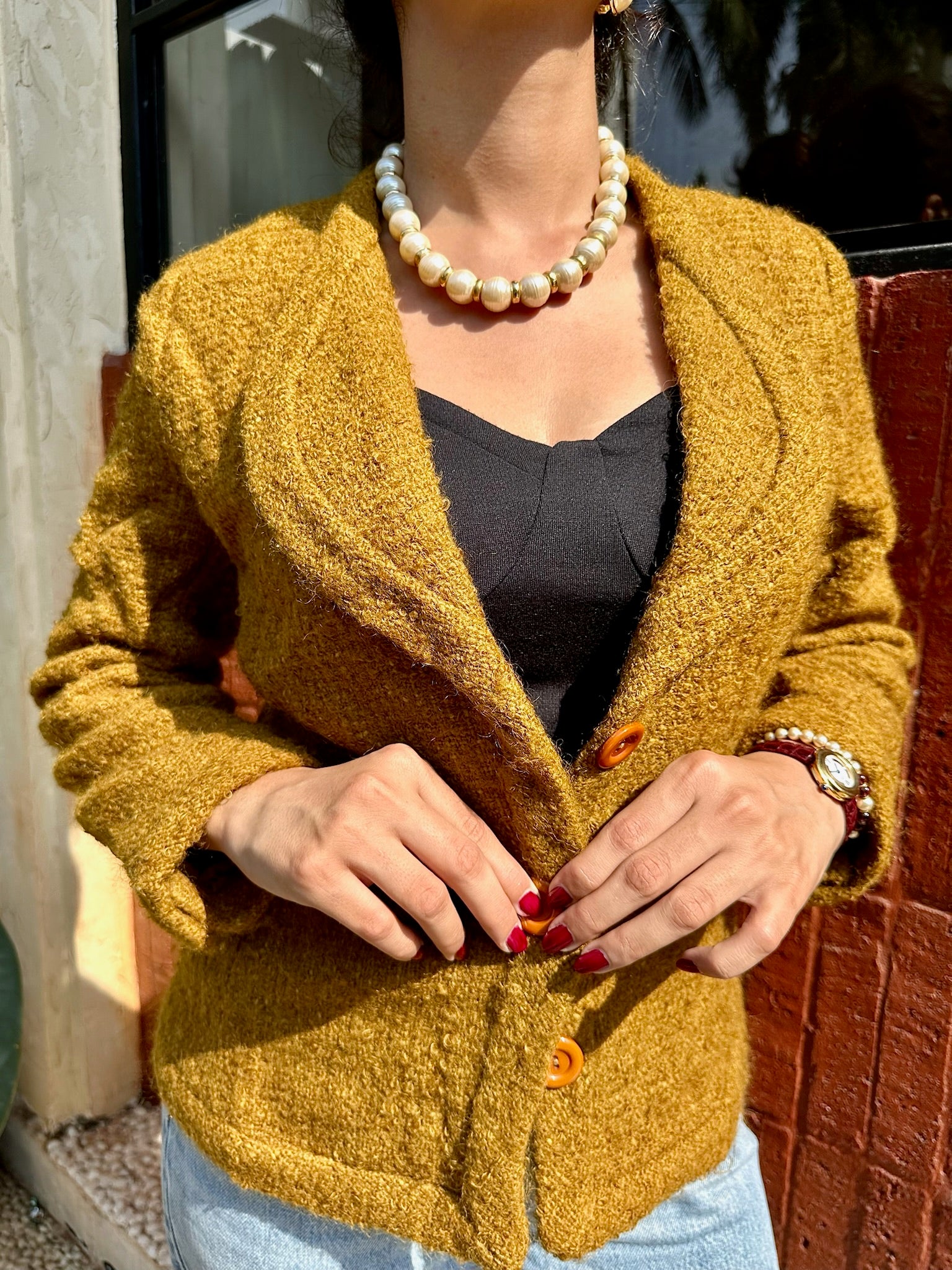 A vintage collectible, tailored intricately with an ochre coloured fuzzy tweed featuring an open front and notch lapels